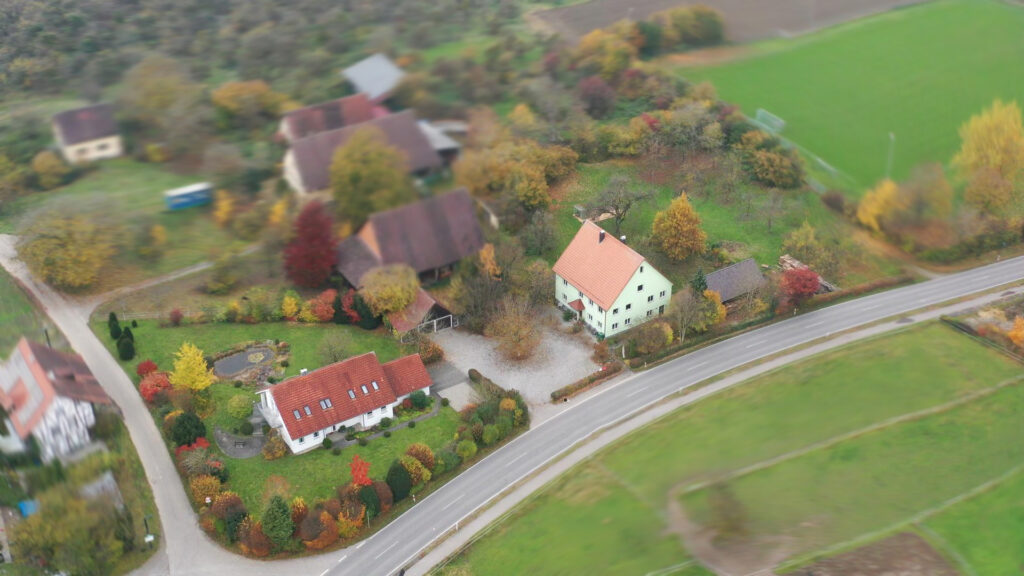 Das ursprüngliche Gebäude, der „Hof“, wurde 1842 erbaut und befindet sich seither in Familienbesitz. Das Haus ist als 2-Familienhaus ausgewiesen, teilunterkellert mit einem alten und benutzbaren Gewölbekeller. Es verfügt über ca. 300 qm bewohnbare Fläche inkl. einem ausbaubaren Dachboden mit einer zusätzlichen Fläche von ca. 150 qm. Das Gelände umfasst 1.199 qm.